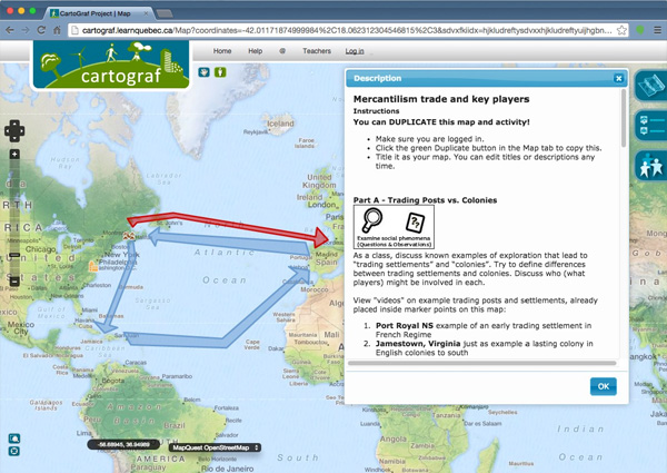 Teachers may want to create learning scenarios that use the Cartograf mapping space. Typically the Description area of the map is used to add instructions. However, you can also add instructions inside a Point of Interest markers, Shapes or Lines. Similarly, students can respond to questions in either place, once they have duplicated the original map or started their own.But what is a "scenario"? Click HOME to view a few samples! Scenarios are not really complete units or Learning Situations (though they could be part of one!) Often shorter, a Cartograf scenario is more like series of activities that involve mapping skills and possibly image editing inside the tool. Usually only a few intellectual operations are practiced, and sometimes even evaluated.